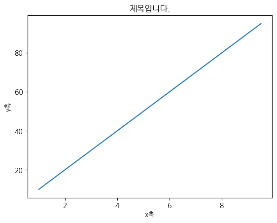 In [16]:x = np.arange(1, 10, 0.5) y = x * 10 plt.plot(x, y) plt.xlabel('x축') plt.ylabel('y축') plt.title('제목입니다.') plt.show()
